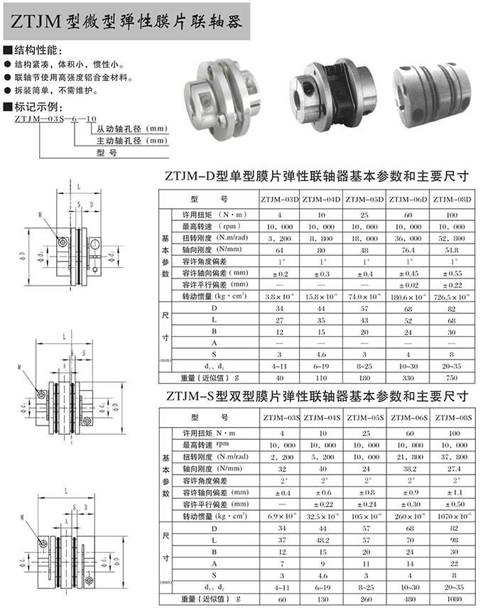 瑞安市寶德隆機械配件有限公司提供ZTJM型微型彈性膜片聯(lián)軸器具有拆裝方便,快速安裝等特點,廣泛用于連接/固定輪轂孔和零件的軸,例如齒輪,錐齒輪,鏈輪,葉輪,凸輪,皮帶輪和飛輪等軸的聯(lián)結(jié)固定,咨詢電話:18906872378