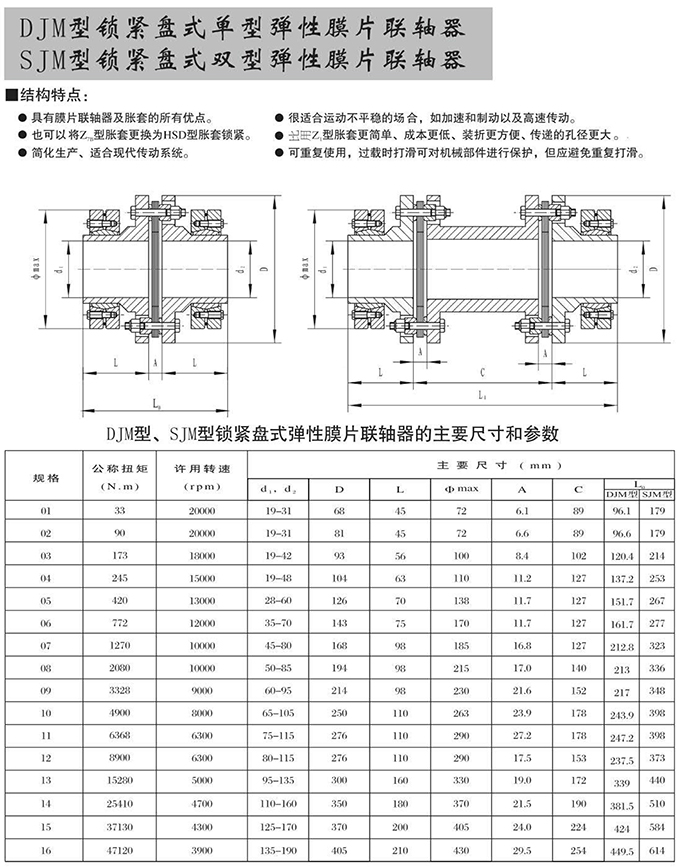 瑞安市寶德隆機(jī)械配件有限公司提供DJM型鎖緊盤(pán)式單型彈性膜片聯(lián)軸器SJM型鎖緊盤(pán)式雙型彈性膜片聯(lián)軸器具有拆裝方便,快速安裝等特點(diǎn),廣泛用于連接/固定輪轂孔和零件的軸,例如齒輪,錐齒輪,鏈輪,葉輪,凸輪,皮帶輪和飛輪等軸的聯(lián)結(jié)固定,咨詢電話:18906872378