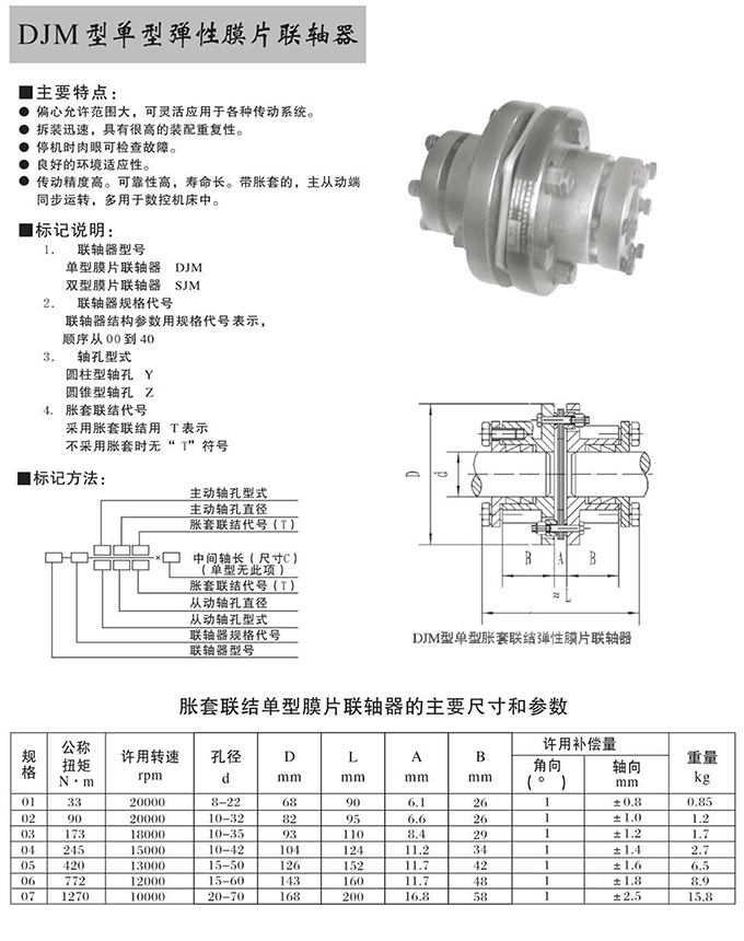 瑞安市寶德隆機(jī)械配件有限公司提供DJM型單型彈性膜片聯(lián)軸器具有拆裝方便,快速安裝等特點,廣泛用于連接/固定輪轂孔和零件的軸,例如齒輪,錐齒輪,鏈輪,葉輪,凸輪,皮帶輪和飛輪等軸的聯(lián)結(jié)固定,咨詢電話:18906872378