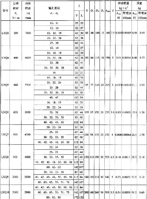 LXQ接中間軸球鉸型星形彈性聯(lián)軸器基本性能參數(shù)和主要尺寸: